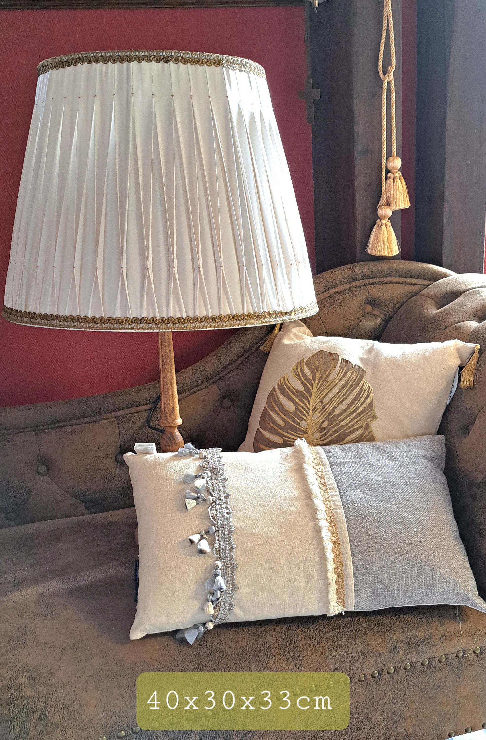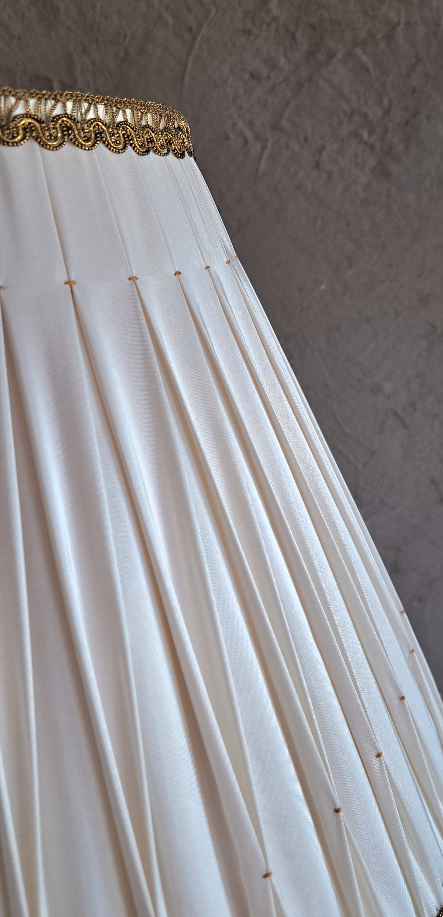 Looking for a timeless, elegant touch for your interior? This pleated smocked lampshade in ivory silk with golden accents is a true statement piece. Perfect on all lamp base, it catches the eye with its refined simplicity and regal charm.