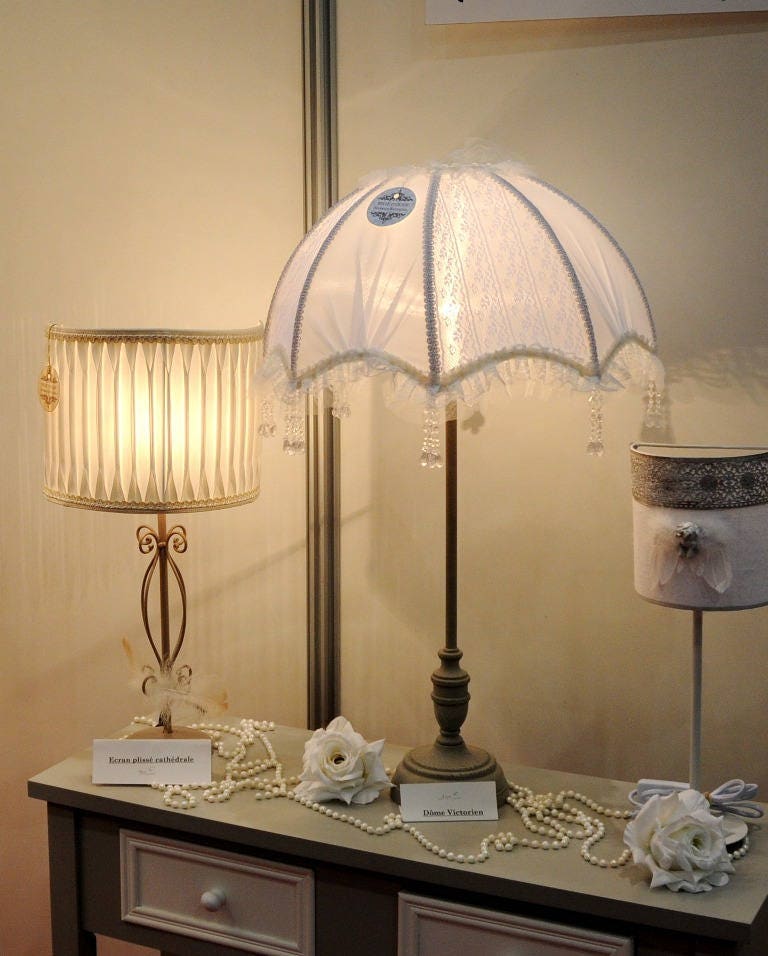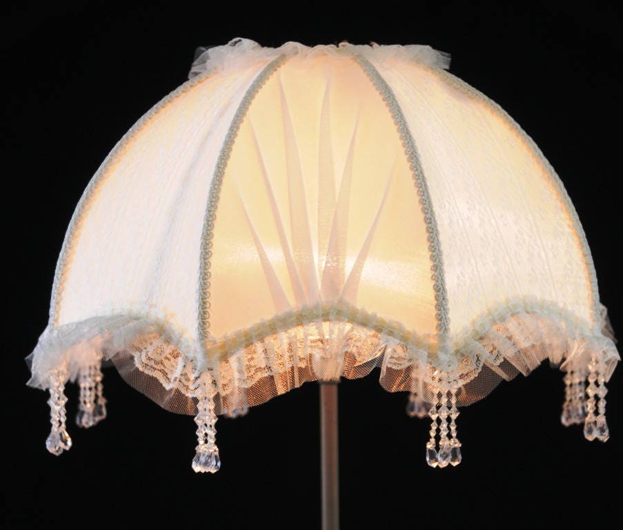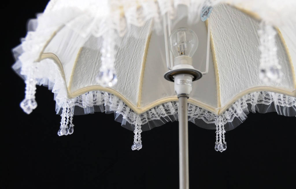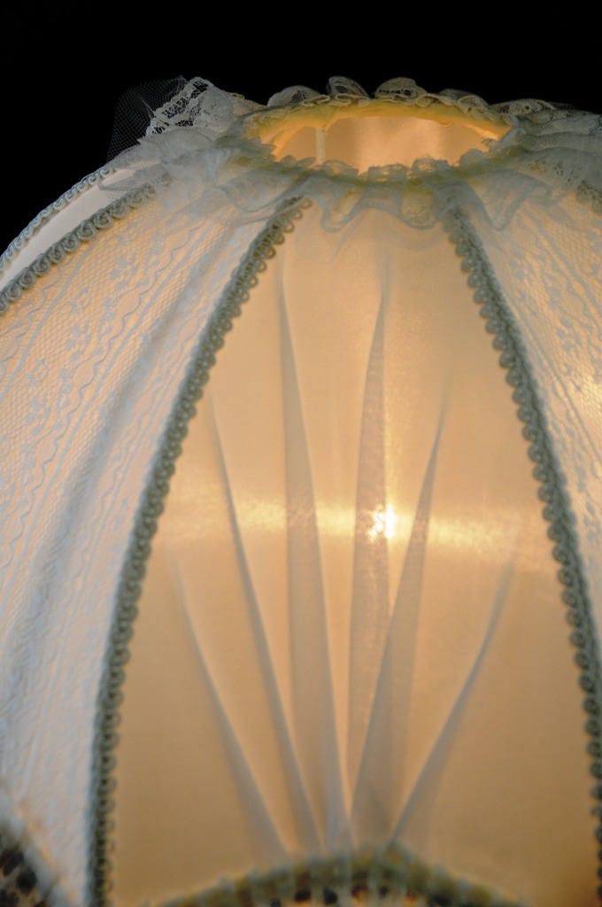 Umbrella dome, covered with lace and white muslin, top and bottom scalloped with frilly tulle lace and transparent tassels at the ends. Handmade entirely.
